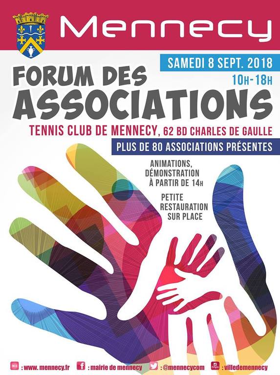 Le samedi 8 septembre 2018 aura lieu le forum des associations de Mennecy de 10h à 18h au Tennis club (près de la piscine de Mennecy)